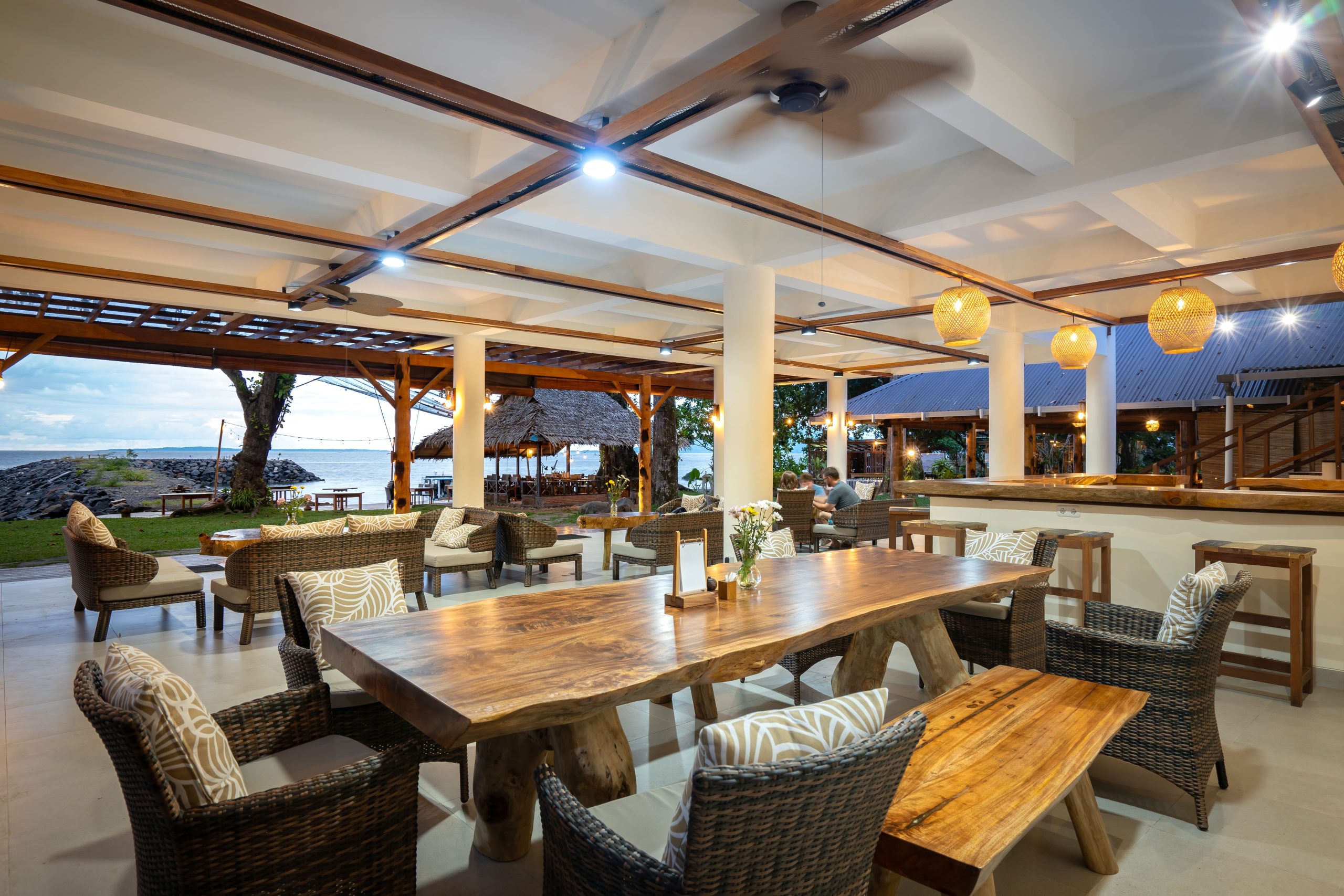 The resort offers indoor and outdoor dining. The restaurant and outdoor dining area are at the heart of the resort, overlooking the ocean. A la carte and family style dining is available on the beachfront or in the main restaurant. The cuisine is a modern mix of western, Asian and Indonesian flavours created using fresh, local ingredients.