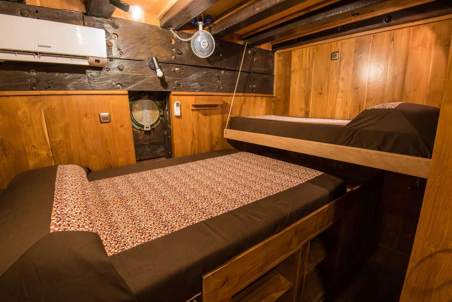 SPECIFICATION: Length 142 ft, Beam 29 ft, Construction Wooden ship with BKI classification, Type Pinisi (Traditional Indonesian Motor Sailer), Engines Yanmar 6HA2M-WHT, 350 PS, Speed 8 – 9 knots Range 1300 nautical miles, Generators 2 x 40 KW Available, Voltage 220v, 50 Hz (110v available in Camera Room), Power: US and EUR standards, Fuel Tank 3000 gallons, Water Tank 2000 gallons and Desalinator, Reverse-osmosis Watermaker