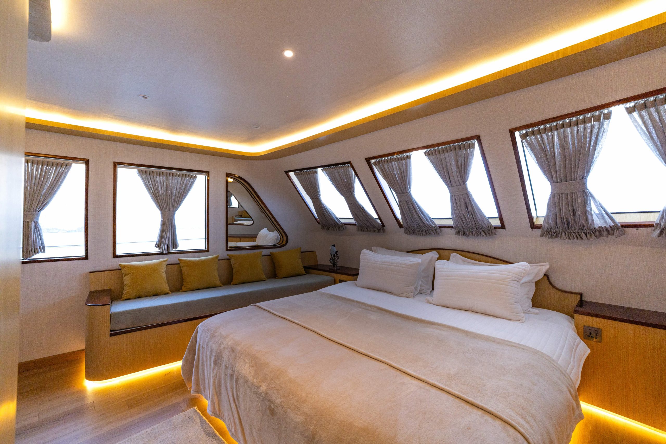 The Master Suite on the main deck is the most spacious cabin onboard. It features a queen-sized bed, large windows that provide natural daylight, and ample storage space. The en-suite bathroom is fully equipped for comfort and privacy.