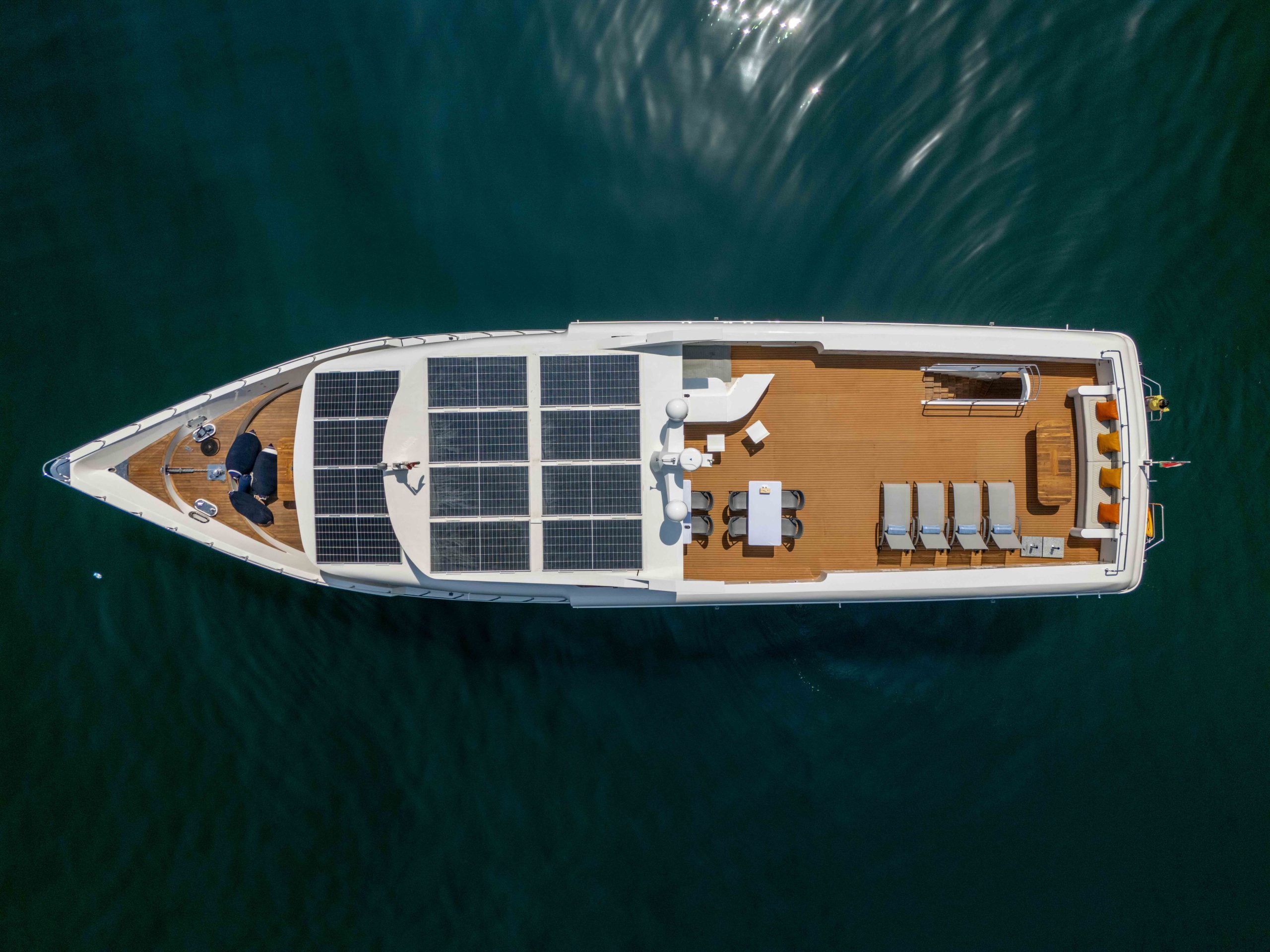 On the main deck you will find the dining room with a large dining table & comfortable seating, a cosy, air-conditioned saloon with sofas, audio & visual entertainment, and a spacious dive deck with individual dive gear stations. There is a shaded upper deck suitable for outdoor dining that provides an open-air space with panoramic views, sunbeds and loungers. The yacht’s design has contemporary finishes, including teak flooring and modern, comfortable furnishings.