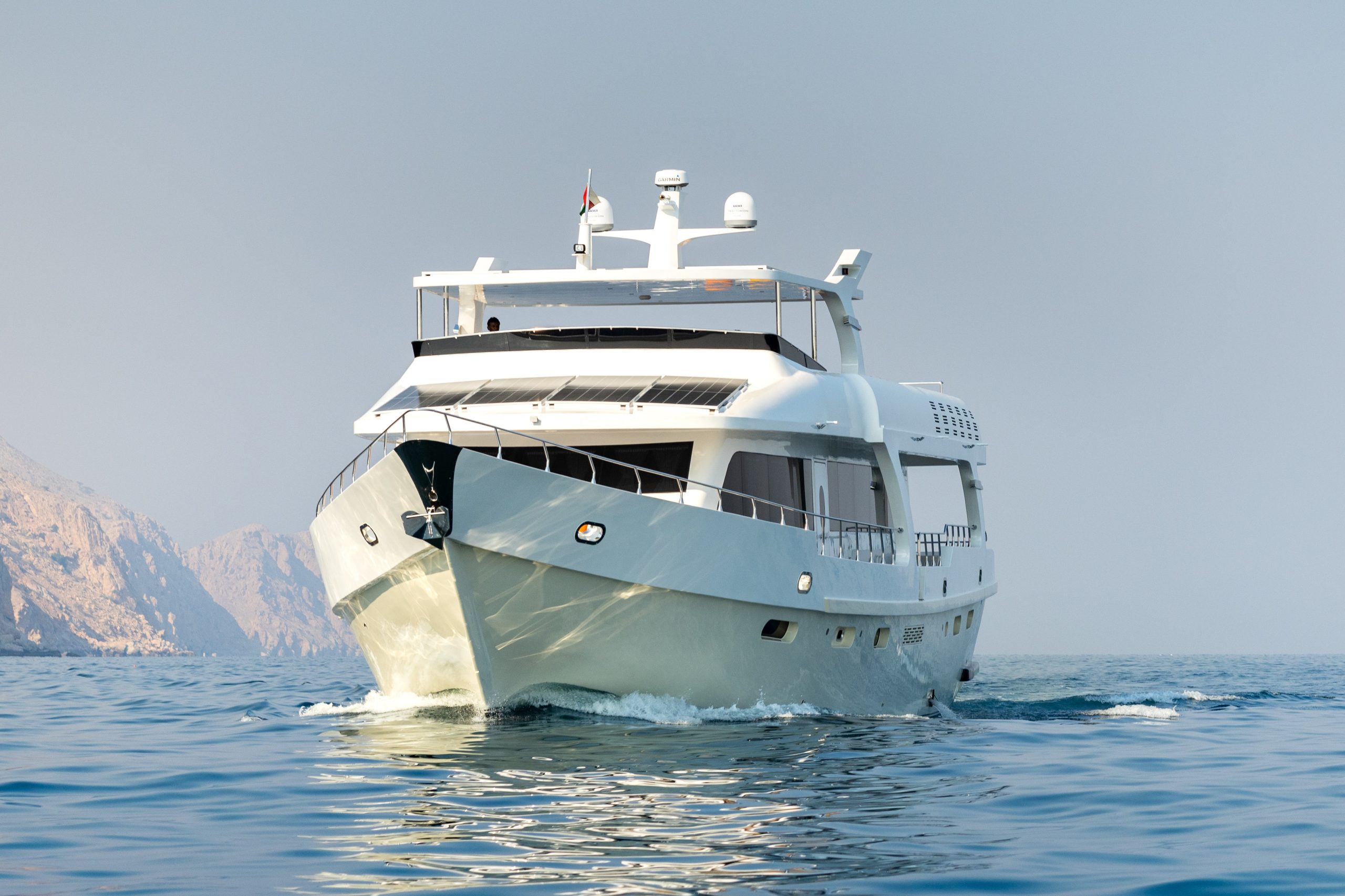 Specification: Motor yacht built in 2025; Construction material: Fibreglass; Length 29m; Width 8m; Draft 3m; Number of decks: 3; Engine: 800HP; Max speed: 16 knots; Fuel consumption: 100 litres/hour; Fuel capacity: 4540 litres; Range: 720 nautical miles; Generators: 2; Power plugs onboard: EU style, UK style, US style at 220v; Desalination with freshwater tank capacity: 3785 litres; Compressor.