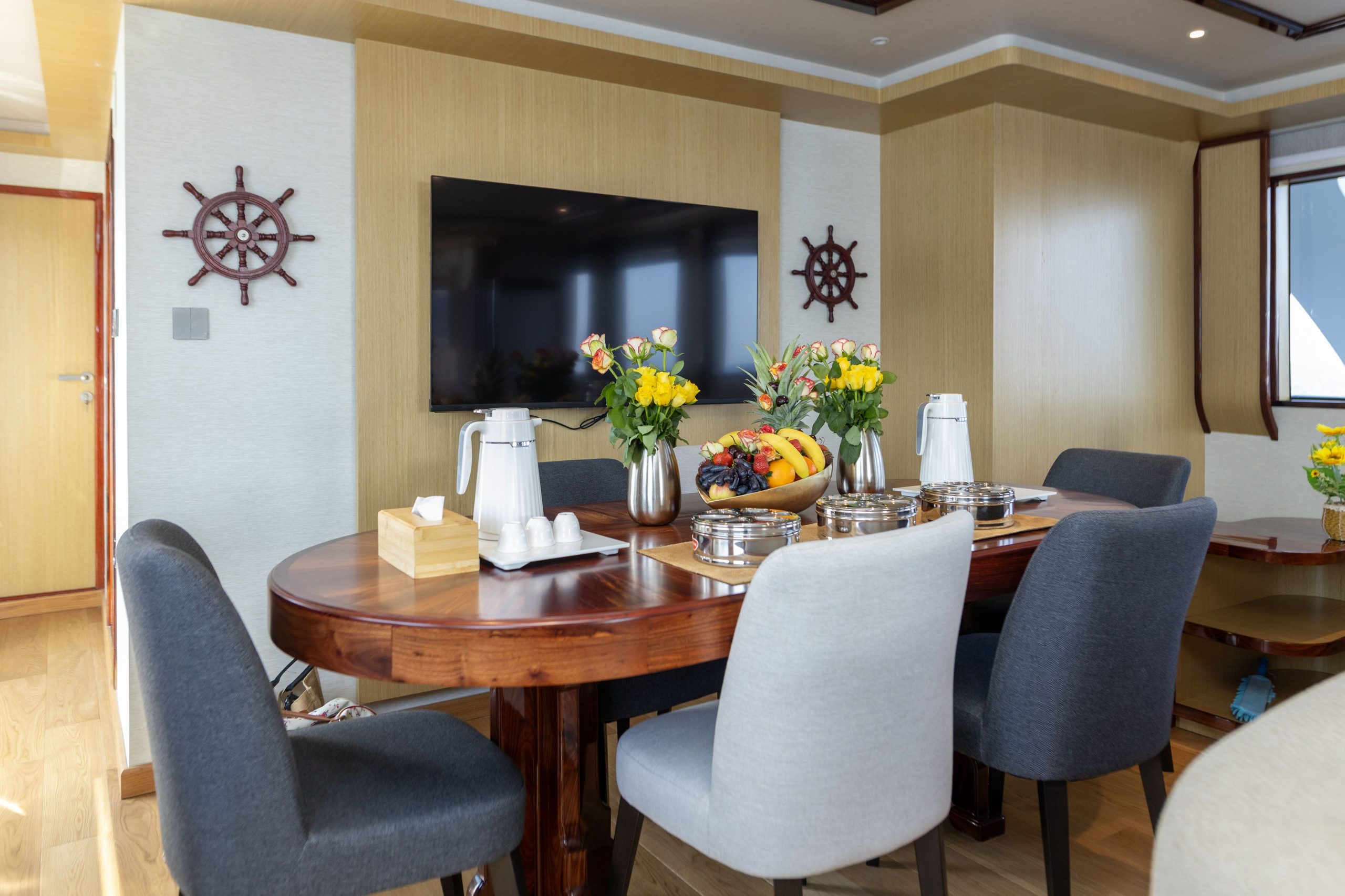 Food, Beverage & Entertainment Facilities: Meals are prepared using local and Western culinary styles, with dishes incorporating seafood and vegetables. Special dietary requirements can be catered for with prior notice. Food is served on the main deck in the comfortable dining room or on the upper deck in an al fresco dining area. Snacks, tea, coffee, and various soft drinks are available throughout the day. Alcoholic beverages and spirits are included as part of your boat package. Entertainment options include board games and an AV system that can be enjoyed from the comfortable lounge. There are also kayaks on board.