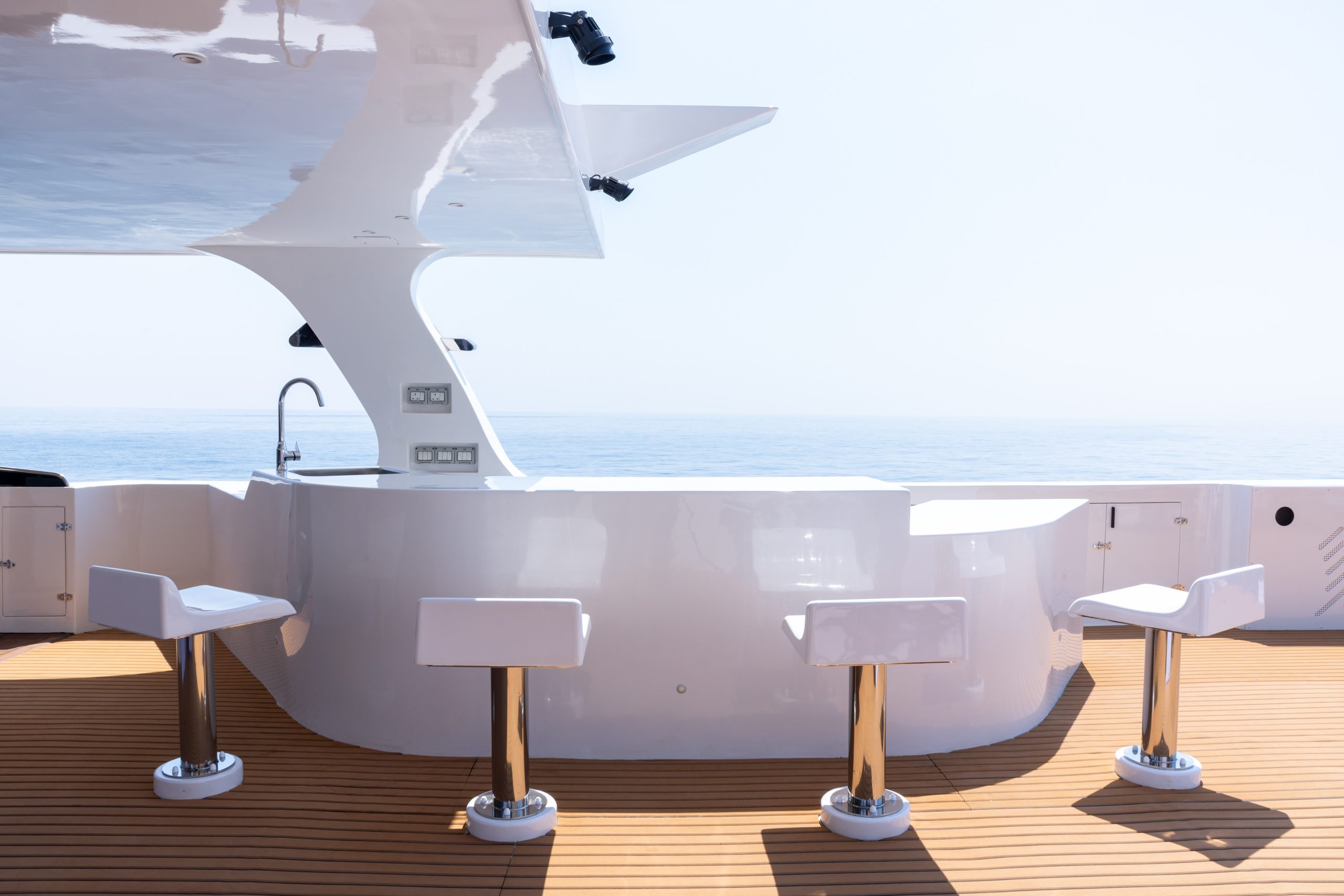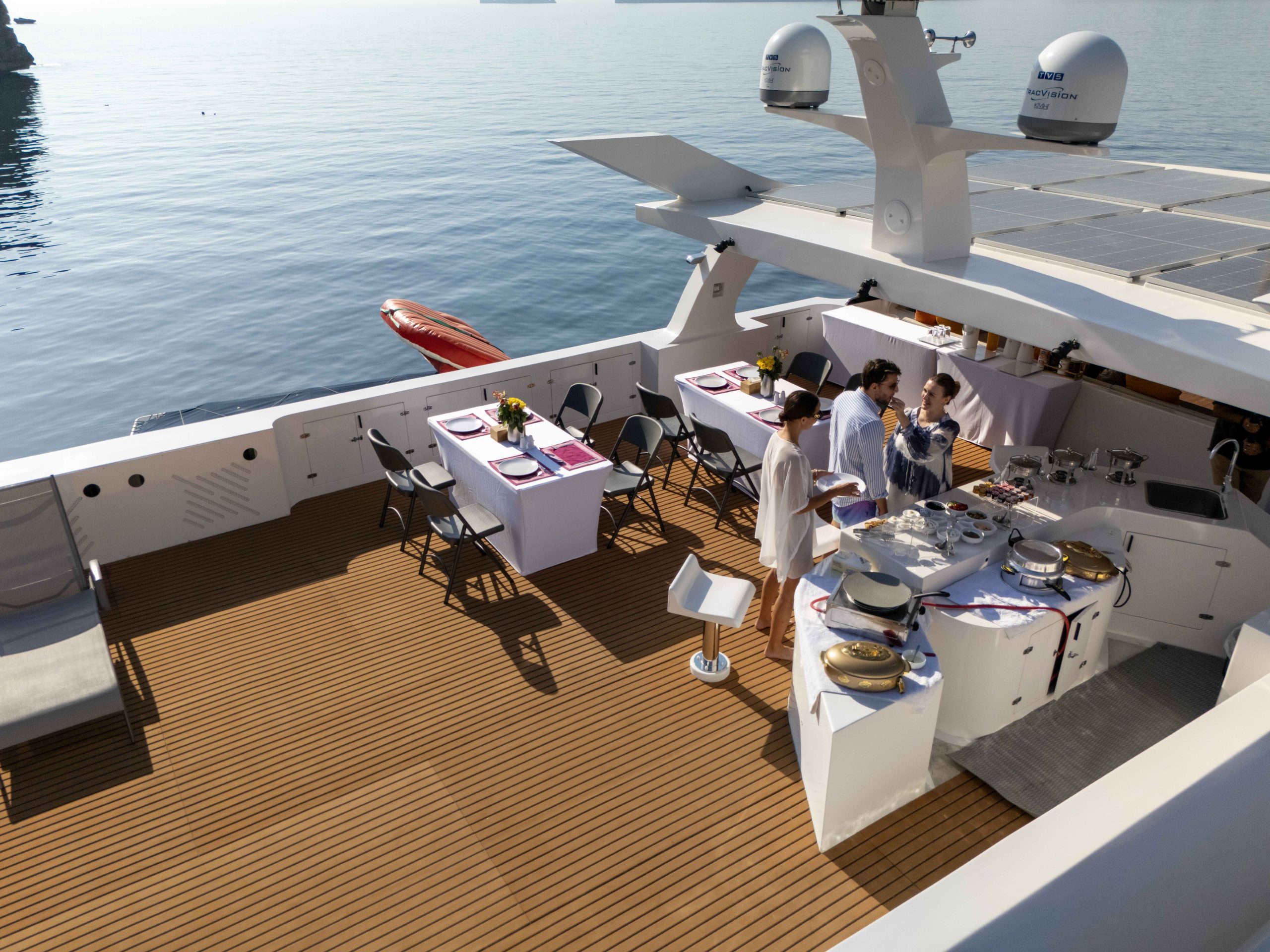 Providing an open-air space with panoramic views, sunbeds, loungers, a bar, and a shaded area, this deck is often used in the evening for dining outdoors.