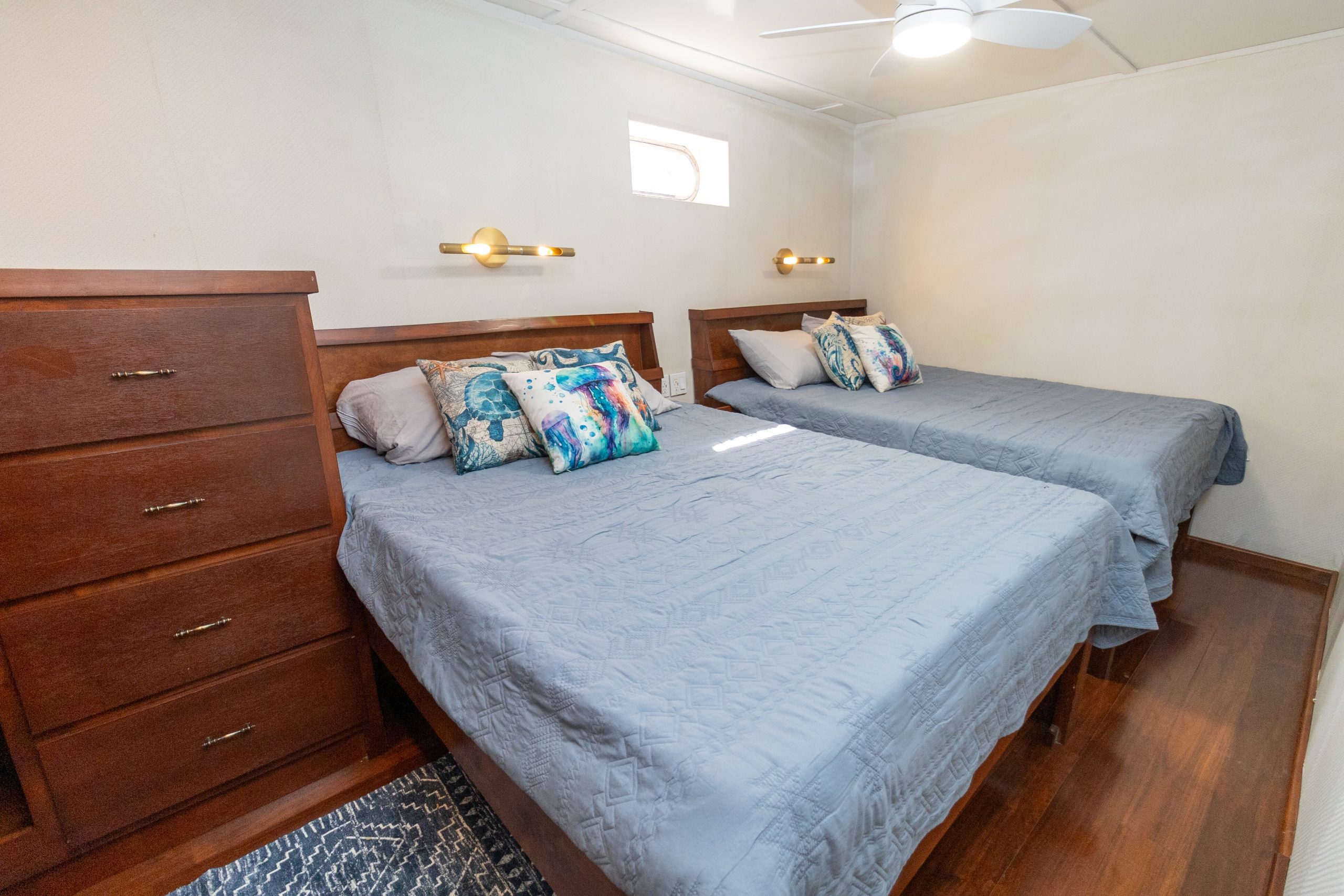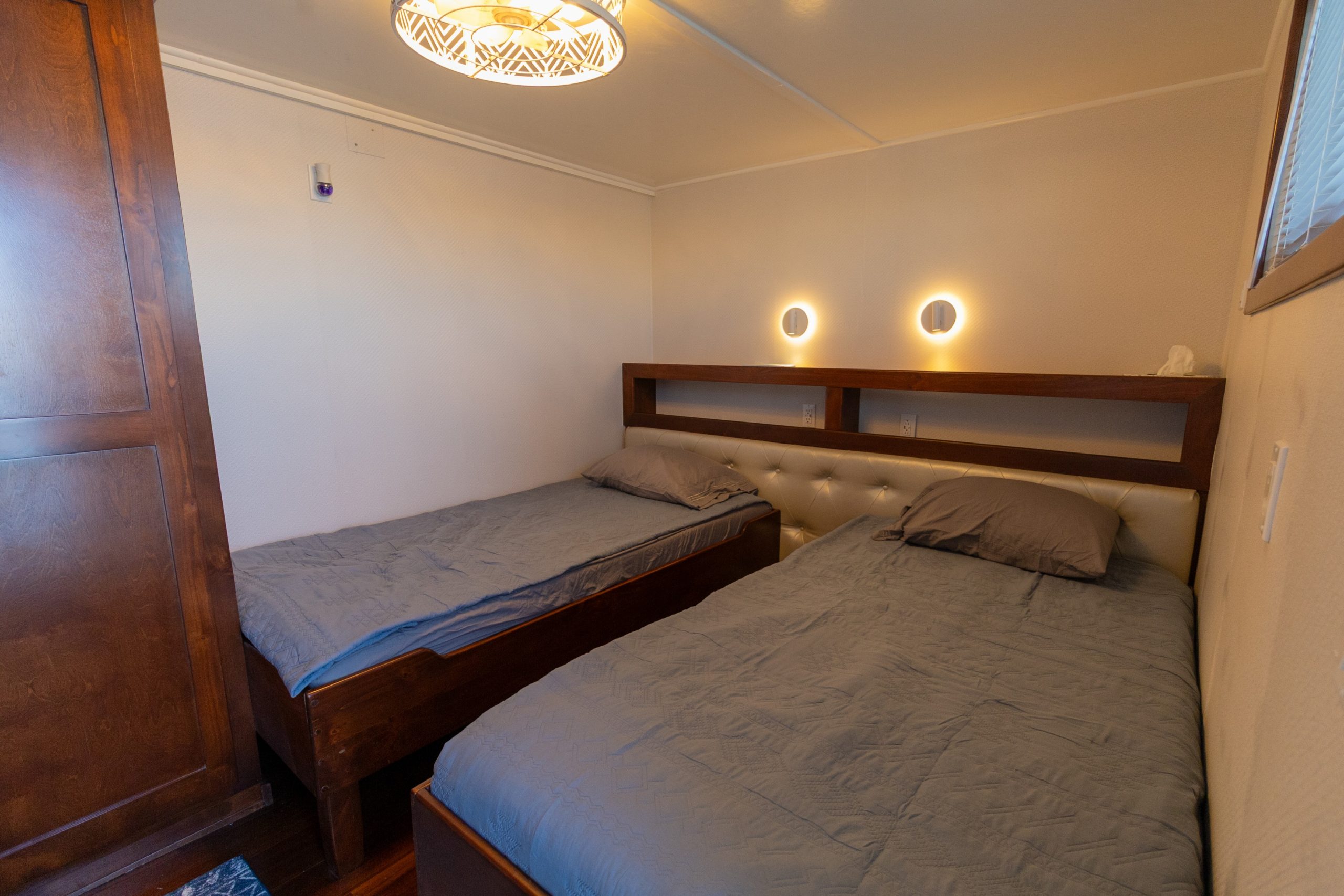 Upper Deck: 8 cabins, 6 cabins have XL twin bunks (cabins 1–6), arranged perpendicularly to maximise space, while 2 cabins (7 and 8) offer twin XL beds that can convert into a king where needed.