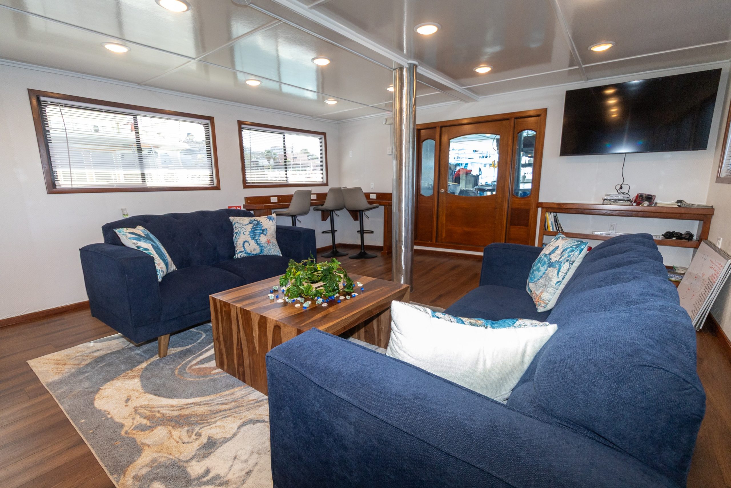 Main Deck: Includes a spacious salon furnished with oversized seating, a dining area, a computer station and a large dive deck. Two freshwater showers and shared restrooms for rinsing off after dives.